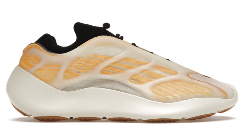 With a yellow and tonal grey Primeknit upper atop a thick EVA foam sole, the adidas Yeezy 700 V3 Mono Safflower is almost identical to the original Safflower release. However, there is one key difference: instead of a stark white TPU lace caging unit, the Mono Safflower opts for a glow-in-the-dark, cream styling, matching the warm look of the sole.