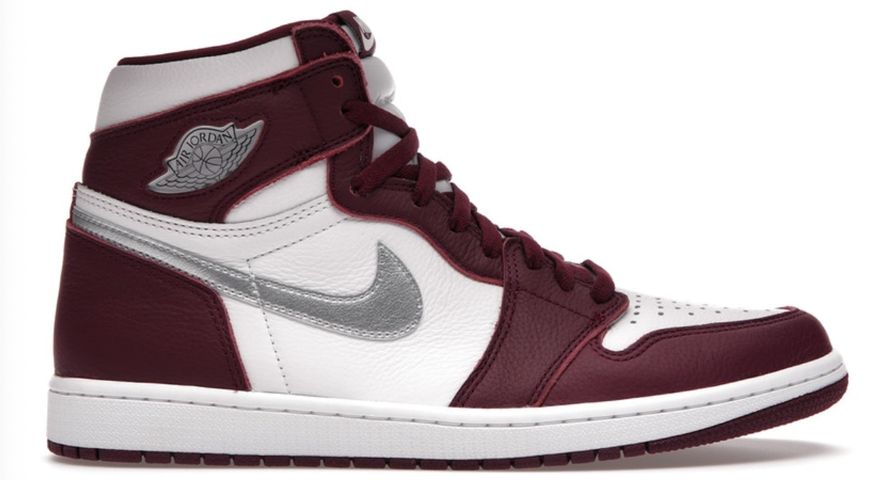 The Air Jordan 1 High Bordeaux features a white with Bordeaux overlays and metallic silver Swooshes. From there, matching woven tongue labels and a Wings logo on the collar nod to the original 1985 Jordan 1 design.