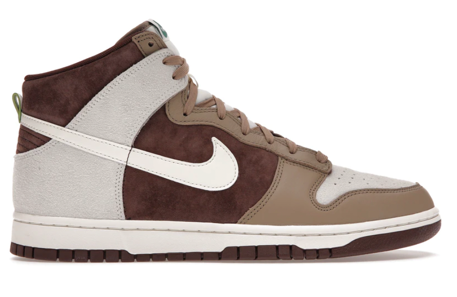Composed of tonal brown and Sail hues, the Nike Dunk High Light Chocolate can be dressed up or dressed down depending on the occasion. Its premium suede and leather construction gives its timeless silhouette a luxe touch, elevating the design. From there, hits of green on the woven tongue label and heel tab add a subtle contrast.
