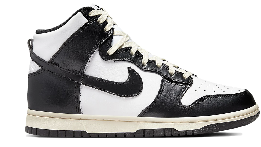 The women's Nike Dunk High Vintage Black (W) features a classic two-toned black and white leather upper. At the base, yellowed laces and soles that give off an aged look complete the design.