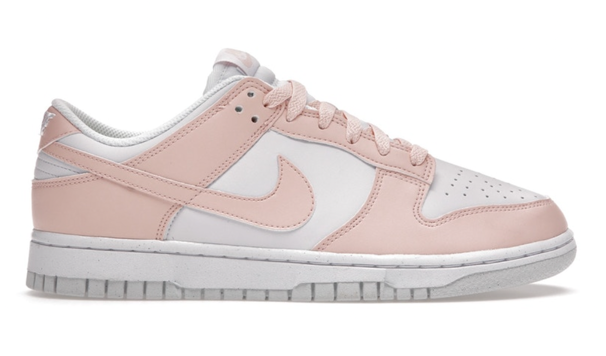 Constructed of 50% recycled materials, the women's Nike Dunk Low Next Nature Pail Coral (W) features a white Flyleather upper with Pale Coral overlays and Swooshes. From there, matching soles and woven tongue labels complete the design.